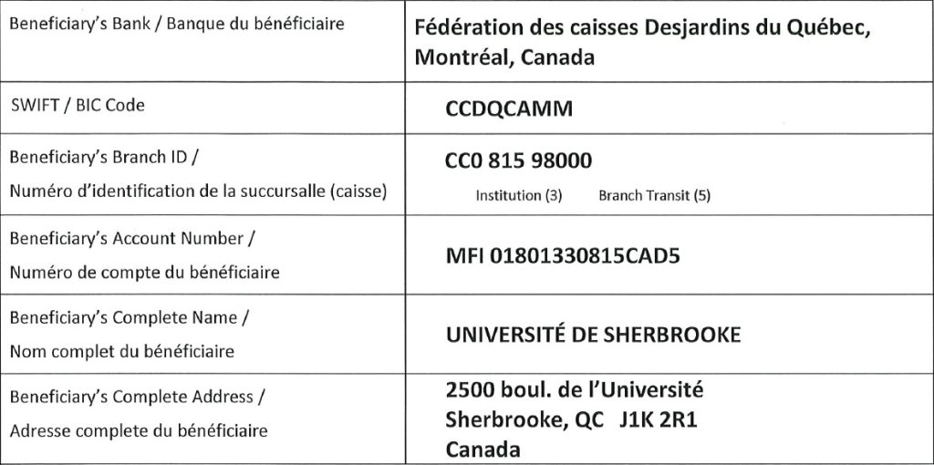 Étape 1– Effectuer le transfert du montant total à l’aide des informations suivantes et envoyer obligatoirement votre preuve de paiement au : ref2026@usherbrooke.ca